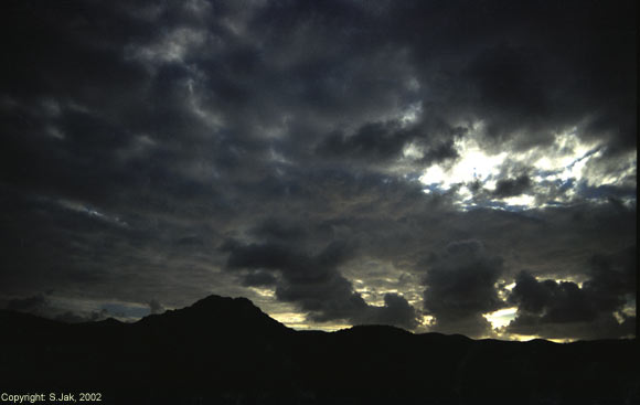 De Christoffelberg, stemming wijzigt per minuut Klik op een kleine foto om deze te vergroten Vanuit het Christoffelpark te Curaçao werd deze reeks foto's gemaakt van een zonsondergang met als fraaie voorgrond de Christoffelberg. In de tropen duurt een zonsondergang en schemering relatief kort. Met een dik half uur is het meestal wel bekeken. In die korte tijd kan de stemming zeer snel wijzigen, van koel en somber grijs, naar warm oranje tot dromerig violet. Gewoon een kwestie van de camera op een statief zetten en zelf even de rust nemen om ervan te genieten, en zo af en toe eens een foto nemen. Met als gevolg een mooie foto-reeks en zelf ook lekker uitgerust! Meer foto's in het