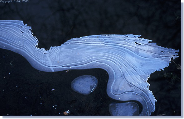 In de eerste week van januari 2003 vroor het een paar dagen flink. Na een paar nachten met temperaturen onder de -10°C kwam er zelfs ijs op de Molenbeek, die door de prachtige bossen tussen Bennekom en Renkum stroomt. Door de stroming in deze beek bevriest dat water niet zo niet snel. IJs ontstaat als eerste langs de randen, bij een bocht. Het groeit langzaam verder en als het water wat zakt (wat na de enorme regens van december 2002 het geval was) komen er luchtbellen onder en worden er prachtige patronen zichtbaar. © Foto en tekst: Stefan Jak Laatste