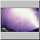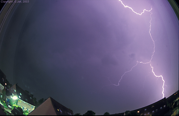 Klik op een kleine foto om deze te vergroten De top-zomer van 2003 was niet alleen heel warm, maar ook erg droog. Dat hield ook in dat er maar weinig onweer voorkwam, jammer voor de fotografen onder ons..... Welgeteld één nachtelijk onweer van formaat deed Bennekom aan die zomer, op 3 juni. Een kortdurende bui kwam aanrollen tegen 23 uur en zette alles even in vuur en vlam. Na een half uur was dat alweer voorbij, de enige echte foto's van fraai onweer die zomer op het diarolletje achterlatend. Merk op dat hier een fish-eye lens (Nikon 16 mm.) gebruikt is. Een toplens om een enorm groot gedeelte van de lucht in één keer vast te leggen, daardoor is het beeld wat vertekend ('krom'). Niet te voorkomen is de weerspiegeling van eea in het raam, waar doorheen is gefotografeerd. Onder een afdak staan kan soms helpen, maar dan kan je weer niet recht omhoog foto's maken, zonder zeiknat te worden (en de camera naar zijn grootje te helpen), want het spoelde hier van de regen. Meer foto's in het Archief Kijk voor tips voor het fotograferen van onweer in